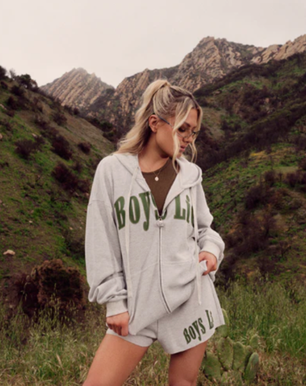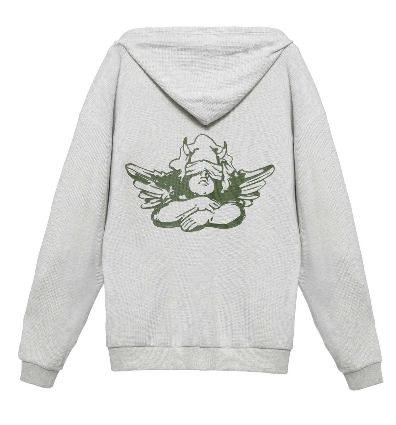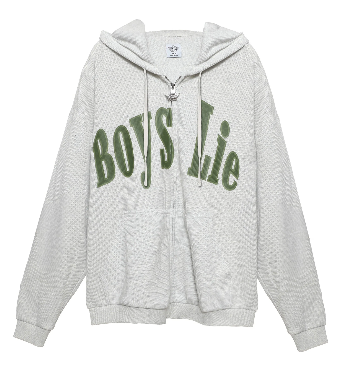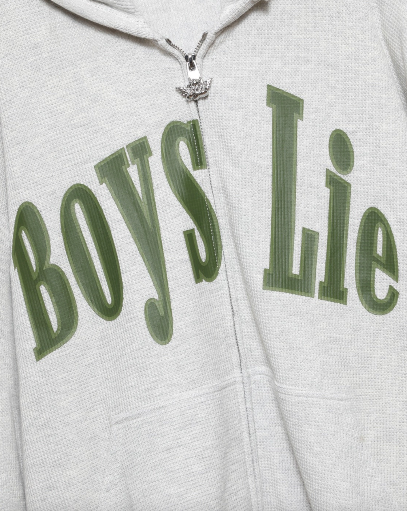 Layer up with the All-Star V2 Harley Zip, your new go-to for effortless cool. Crafted from soft, breathable thermal fabric in light heather grey, this zip-up keeps you cozy without the bulk. Rock the bold "Boys Lie" graphic in army green across the front, while our signature cherub print on the back adds that perfect touch of attitude. Perfect for those days when you want comfort that doesn't compromise on style.