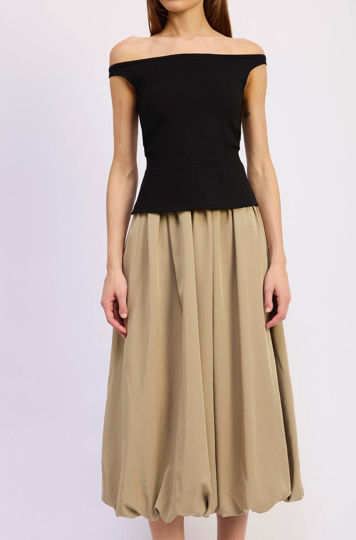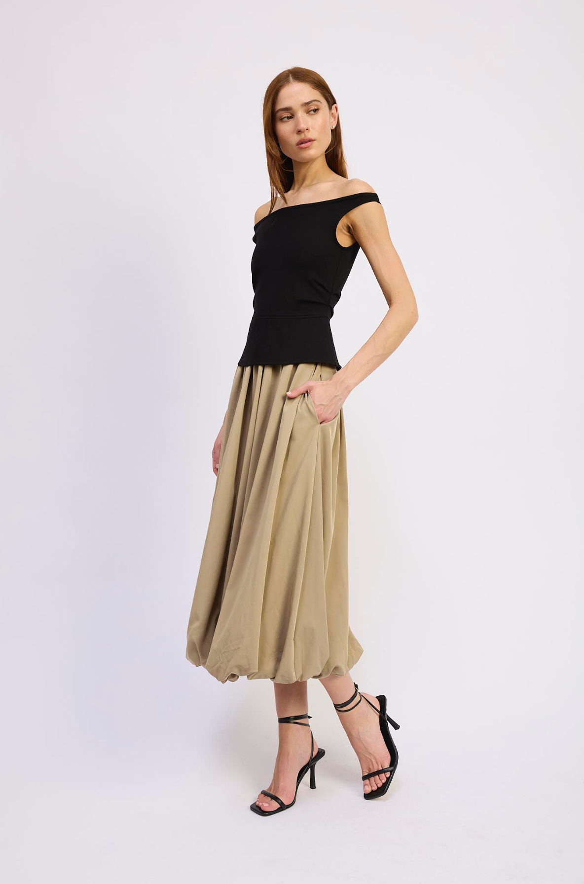 Elevate your wardrobe with this stunning mixed-media dress that effortlessly blends sophistication with playful flair. Featuring a chic khaki and black color palette, the off-shoulder bustier top creates an elegant silhouette while the attached bubble hem skirt adds a fun, dimensional twist. The flowing maxi skirt extends the drama for maximum impact. Crafted with stretch fabric for extreme comfort, you'll move with ease all day long. The convenient zipper closure makes dressing a breeze. Perfect for those moments when you want to feel both classy and carefree.