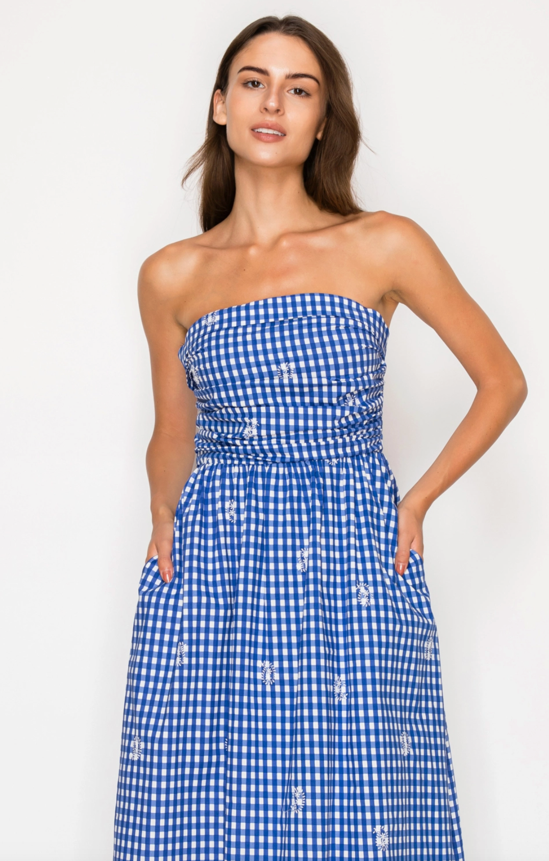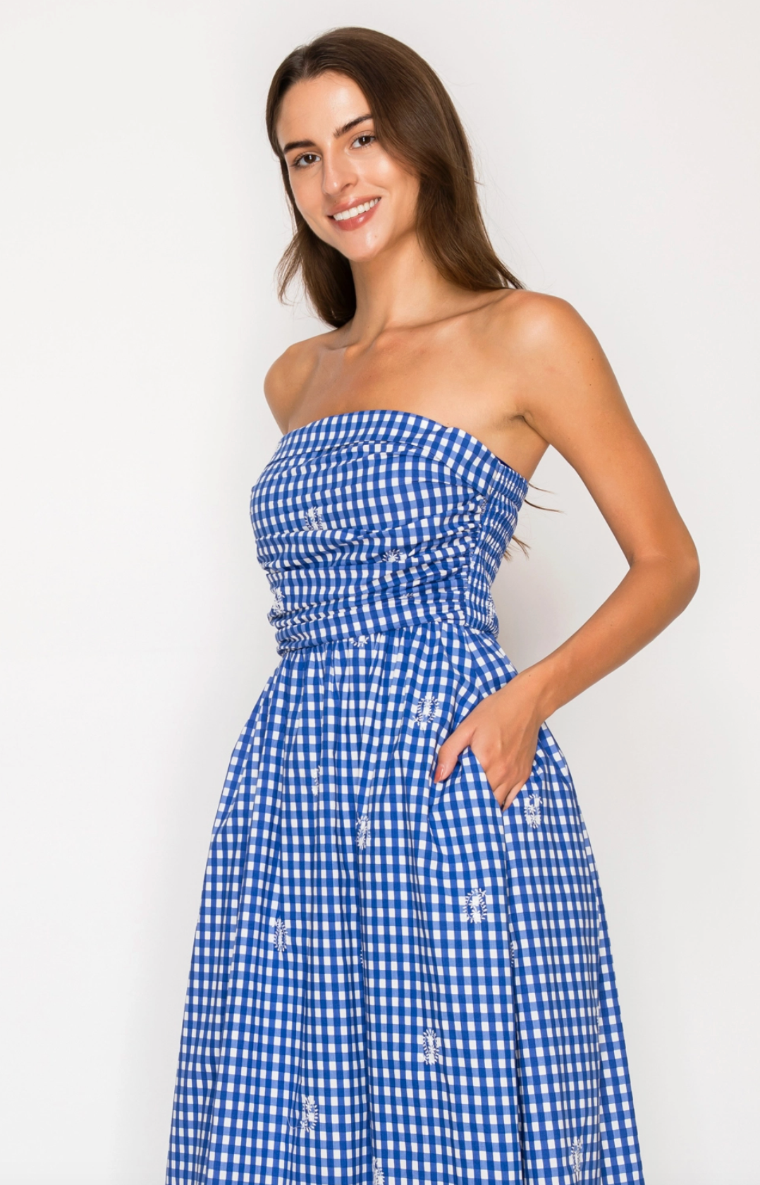 The Azure Lace Tubi Maxi Dress blends Mediterranean elegance with coastal-chic style. Featuring a royal blue and white gingham print accented by delicate white floral eyelet embroidery, this strapless design offers sophisticated visual depth. The ruched, structured bodice flatters while providing a secure fit, flowing into a voluminous skirt with graceful movement. Perfect for seaside weddings, garden parties, and sunset celebrations. Crafted from premium, breathable fabric, it keeps you cool and comfortable while maintaining a polished, high-end appearance all day and into evening.