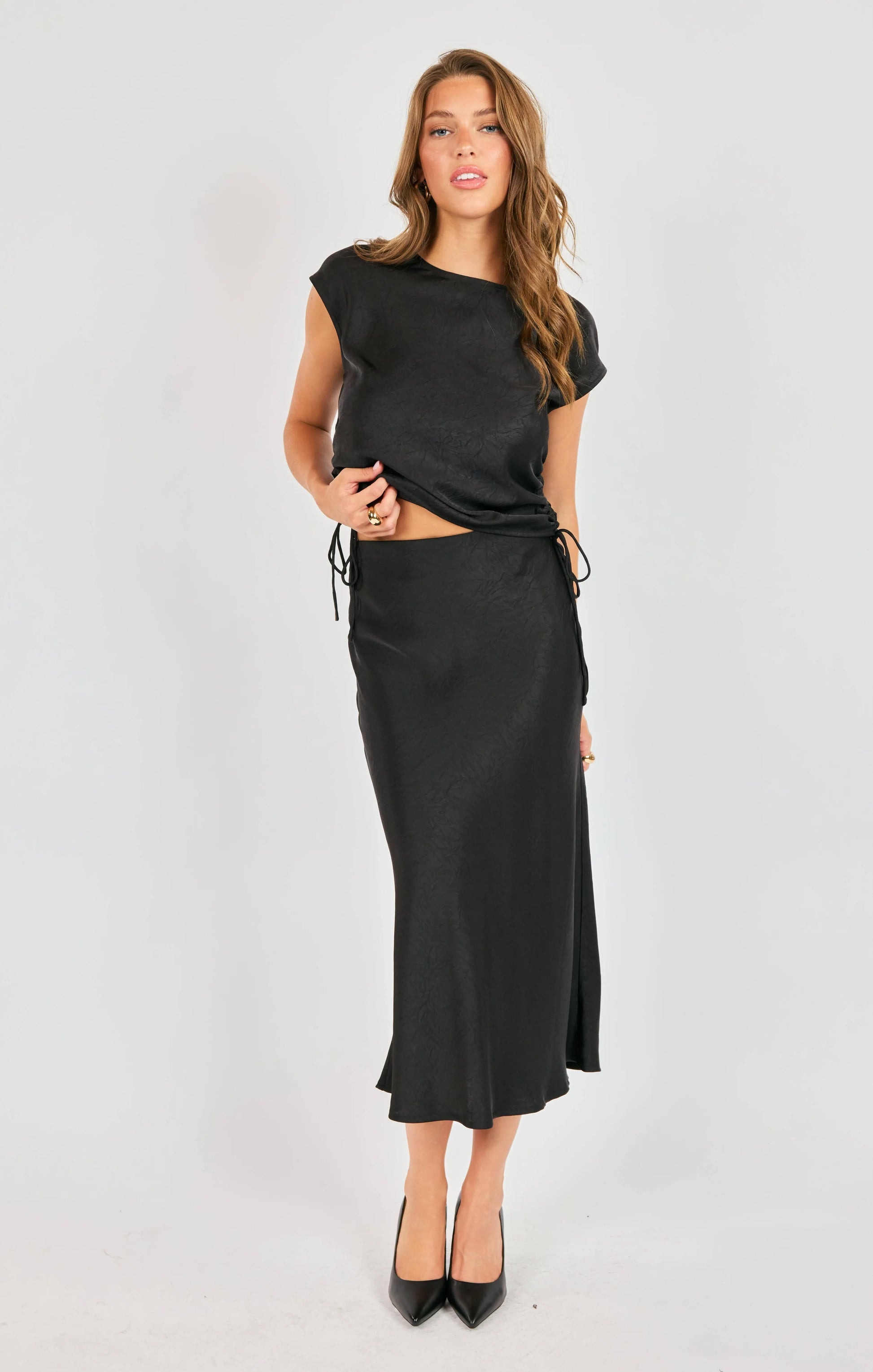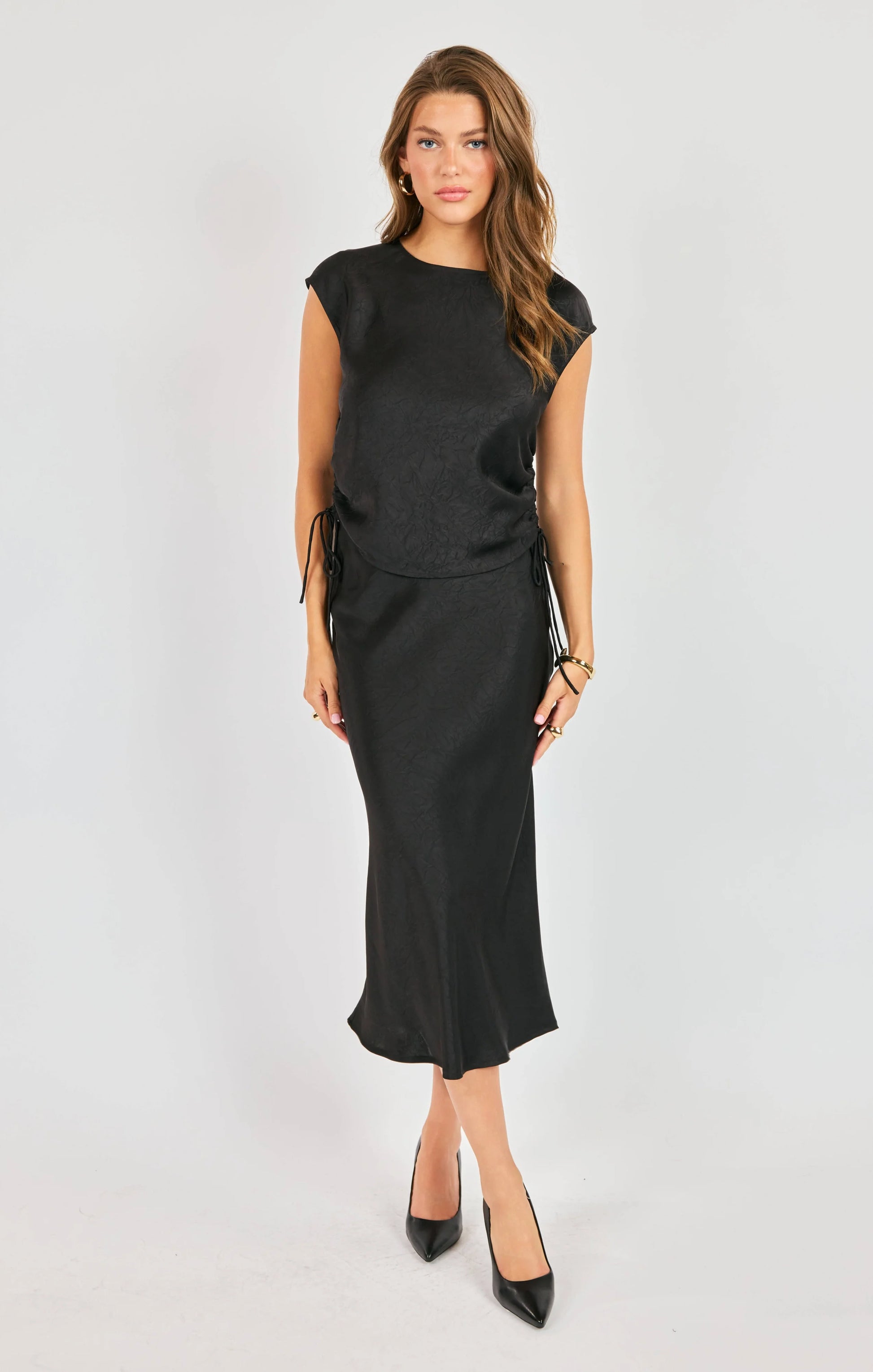 Slip into effortless elegance with the Ceremony Ruched Blouse—a black woven tank that's equal parts sophisticated and fun. Featuring flattering ruched side ties and a sweet cap sleeve, this silky piece keeps things breezy while looking polished. The luxe fabrication drapes beautifully, making it your go-to for casual outings and special occasions alike. True to size for the perfect fit every time.