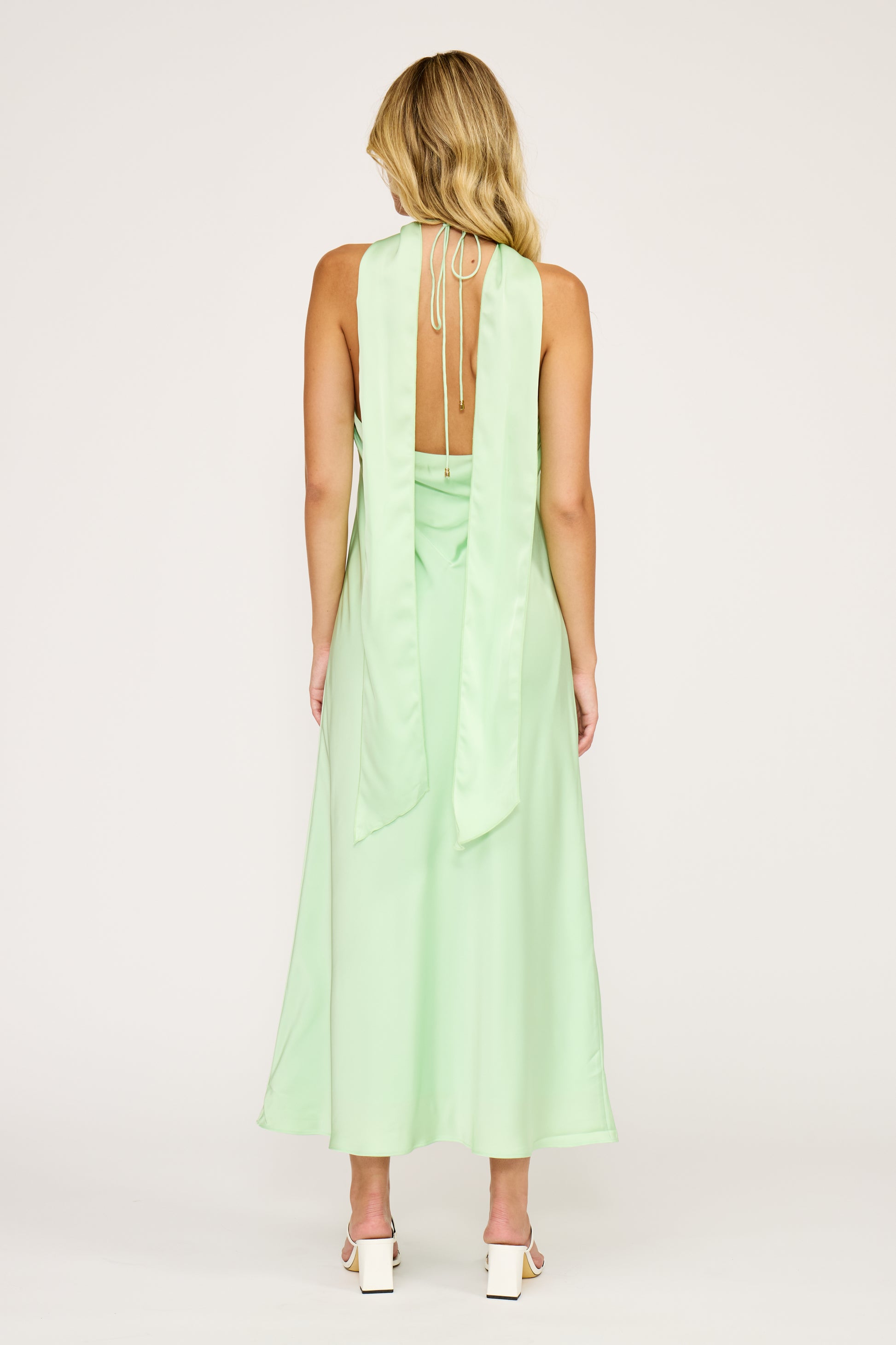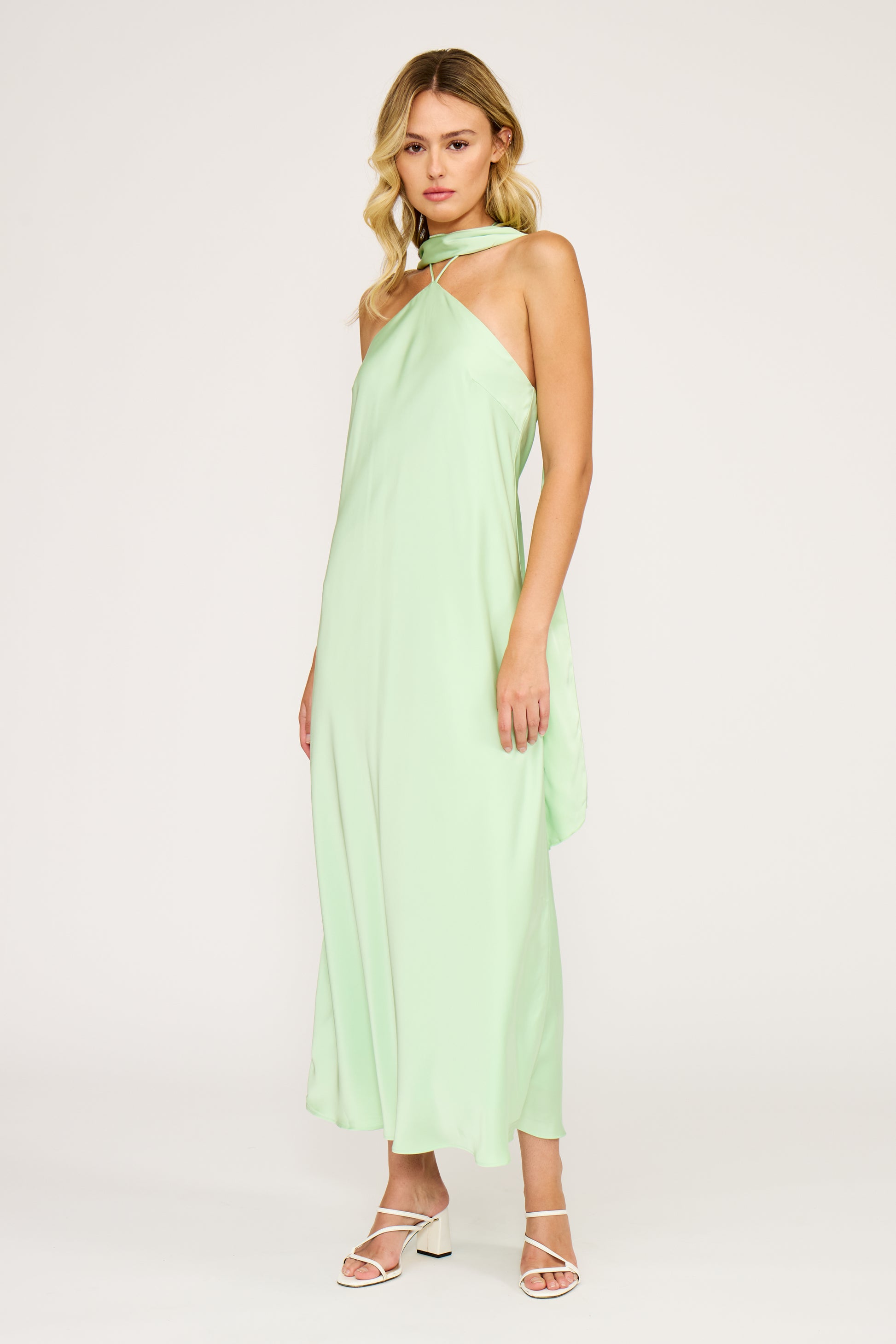 Slip into effortless elegance with the Devon Halter Scarf Dress, a stunning satin piece in soft light green. The flattering halter neckline and self-tie closure create a gorgeous silhouette that moves beautifully with you. Style it solo for a sleek look or layer the included scarf for added dimension and intrigue. Perfect for spring and summer occasions, this dress transitions seamlessly from day to evening with its luxurious drape and timeless appeal.