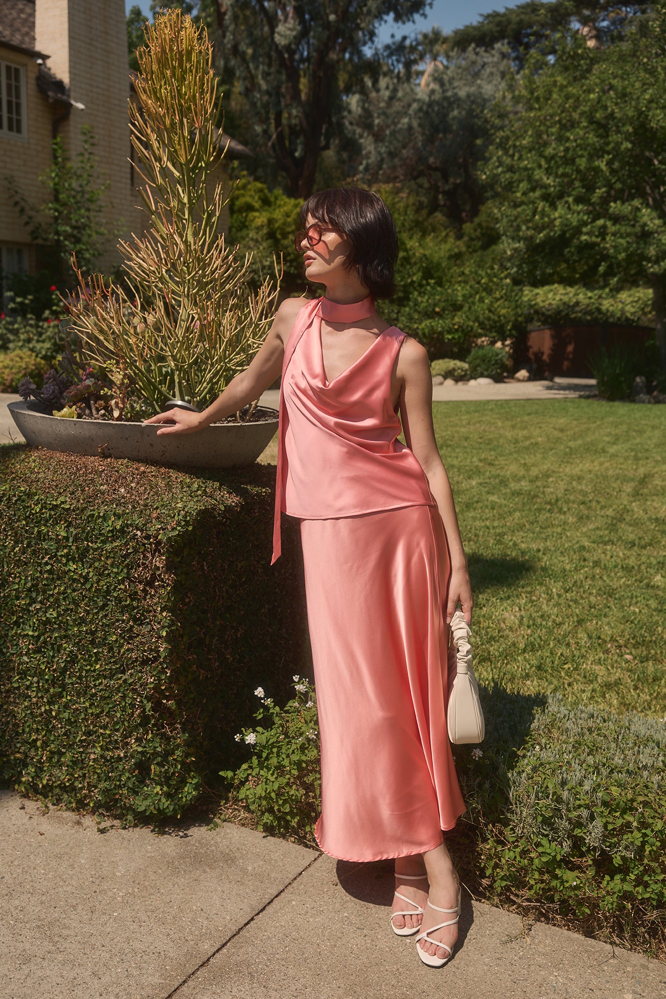 The Fitz Midi Skirt brings effortless elegance to your wardrobe with its luxurious satin fabric in a stunning coral hue. Featuring a comfortable elastic waistband, this versatile piece transitions seamlessly from casual date nights to dressed-up occasions. The perfect spring and summer essential, it's a timeless closet staple that combines sophistication with playful style.