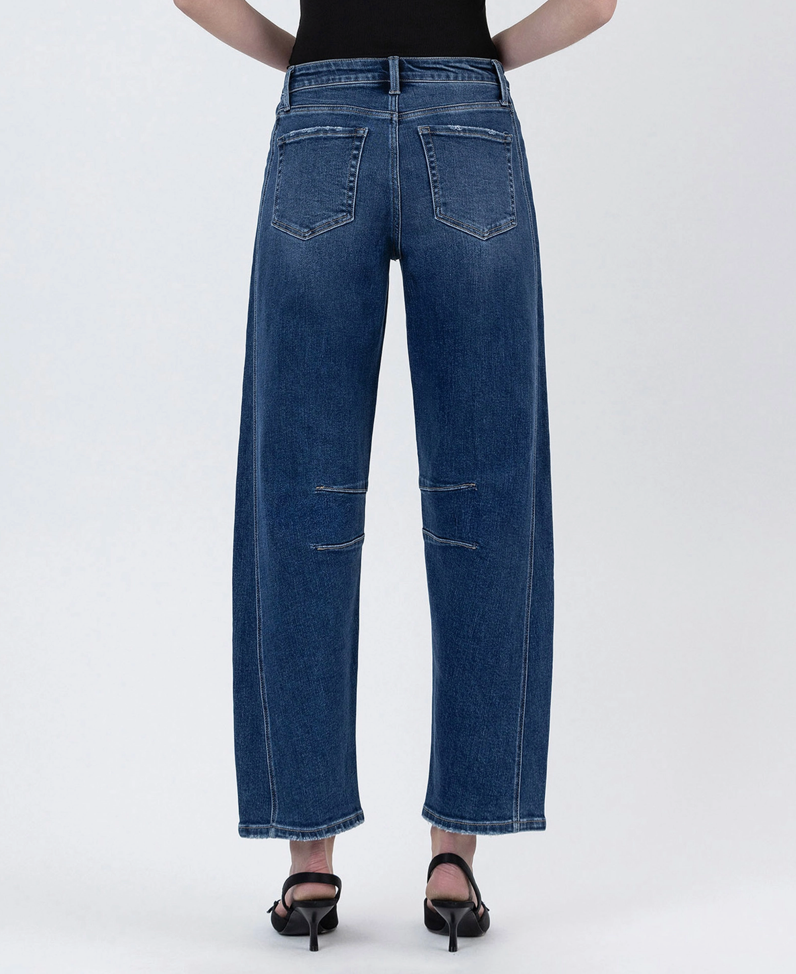 These high-rise barrel leg jeans are your new denim obsession. Crafted from comfort stretch fabric, they hug your curves in all the right places while keeping you moving freely. The cropped barrel silhouette hits just right, paired with a flattering high waist and eye-catching seam details that add personality to every outfit. Finished hem keeps things polished. In a versatile dark wash, they're ready to style with everything from sneakers to heels.