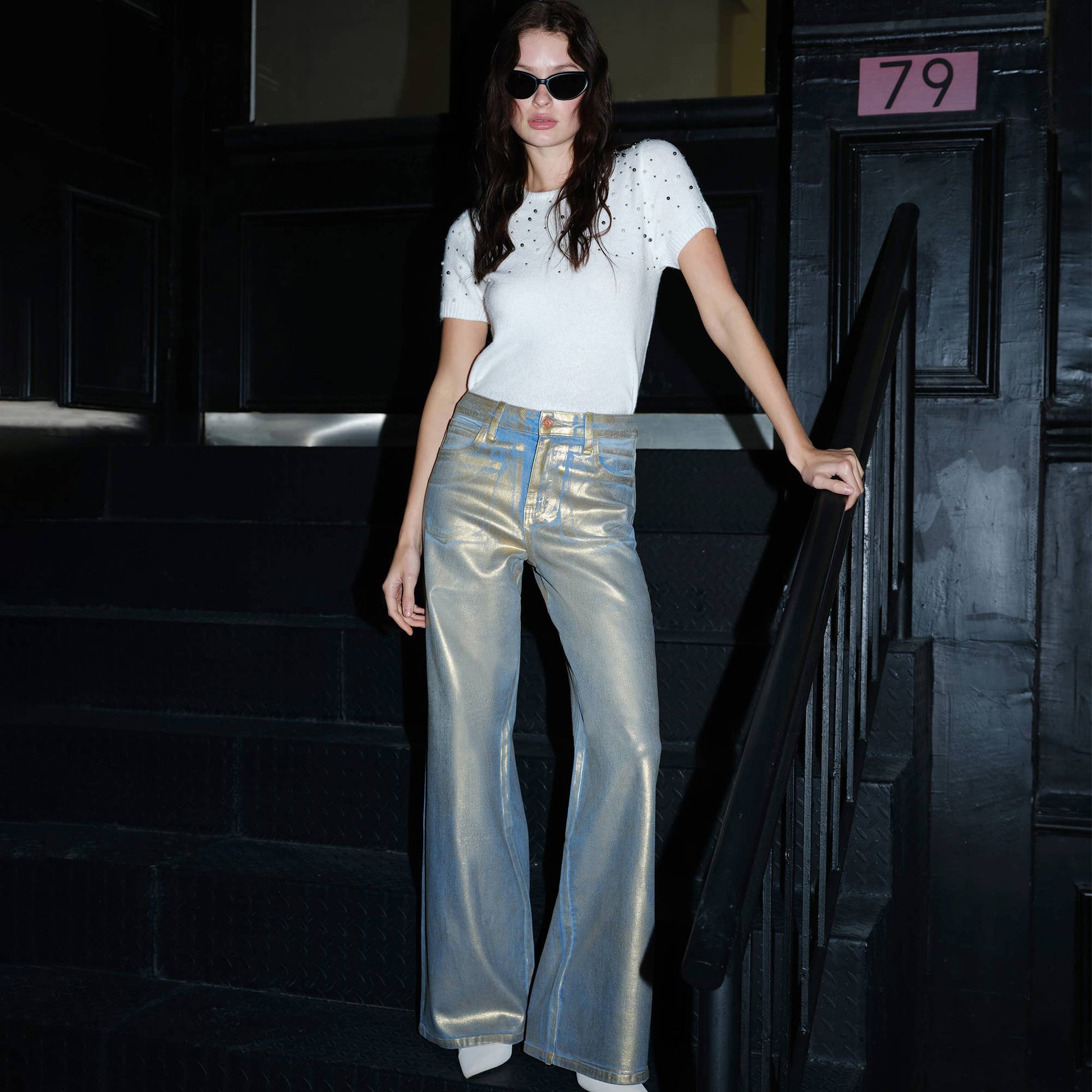 Step into comfort and style with our Foil Wide Leg Denim. Made from super stretchy golden and light blue denim, these jeans feature a high-rise waist and classic five-pocket design. The natural washing effect and foil detailing add a fun, eye-catching touch, while the finished hem keeps the look polished. Perfect for lounging or turning heads, these wide-leg jeans bring playful vibes to your wardrobe with every wear.