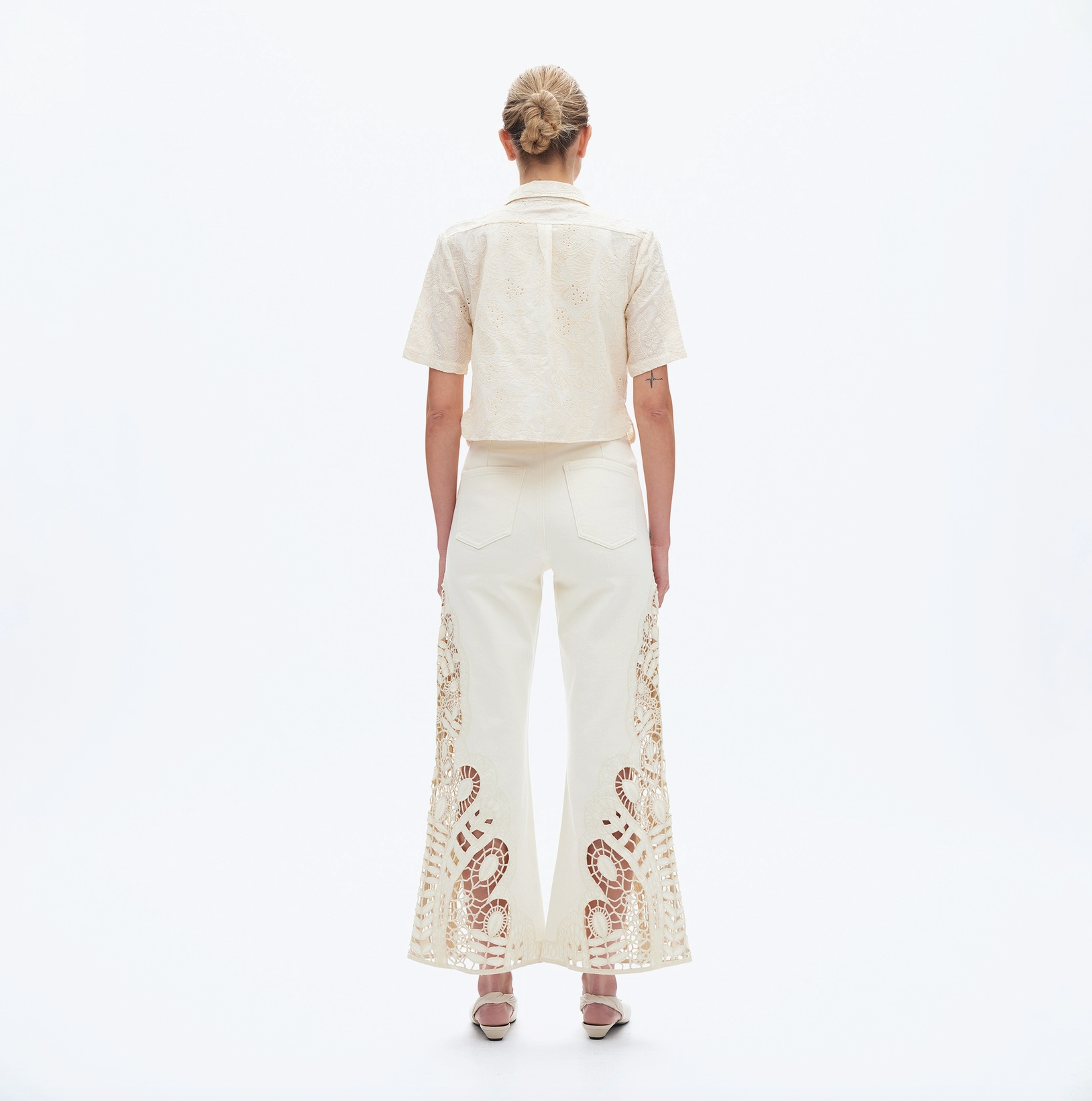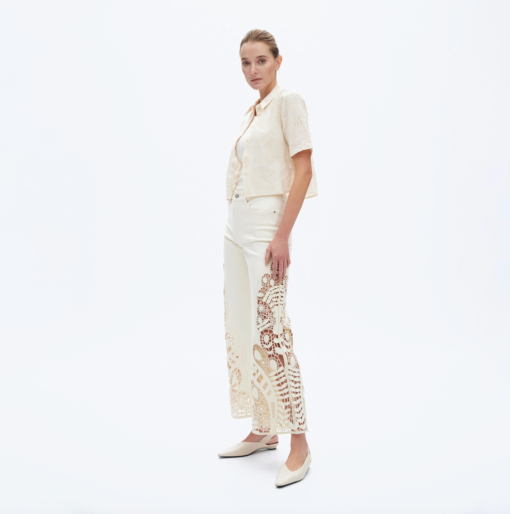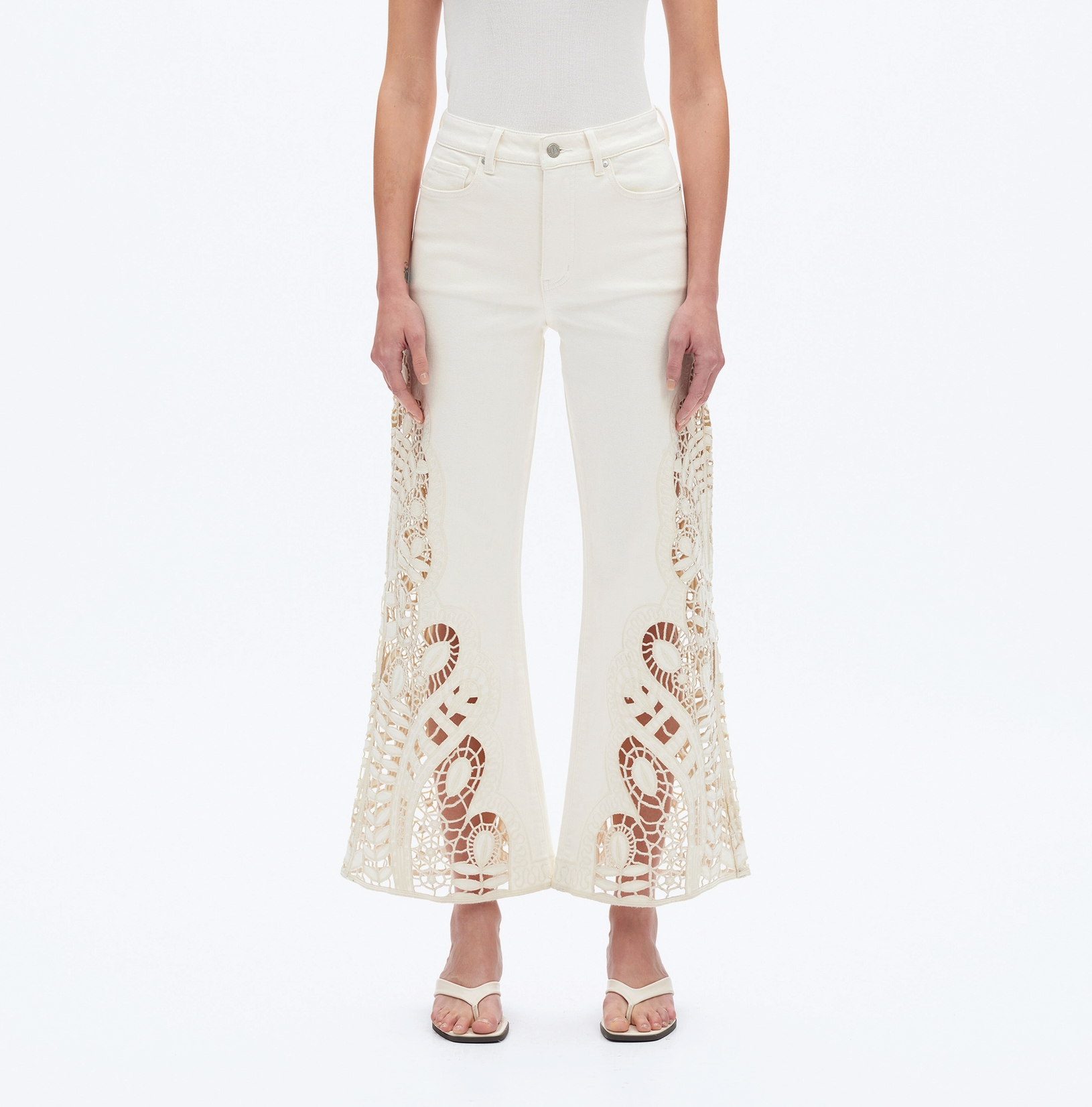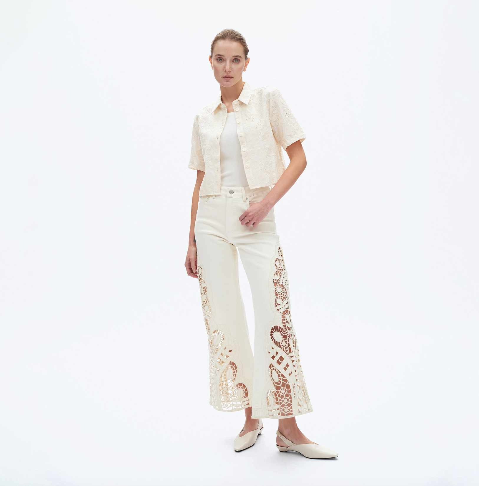 Step into comfort and style with these High Rise Wide Leg Twill Pants. Crafted from soft stretch twill in a versatile beige shade, they feature a playful floral cutout embroidery that adds a fun, unique touch. With five pockets, a high-rise waist, zipper fly, and raw hem, these pants offer an adorable look and a comfortable fit perfect for any casual day.