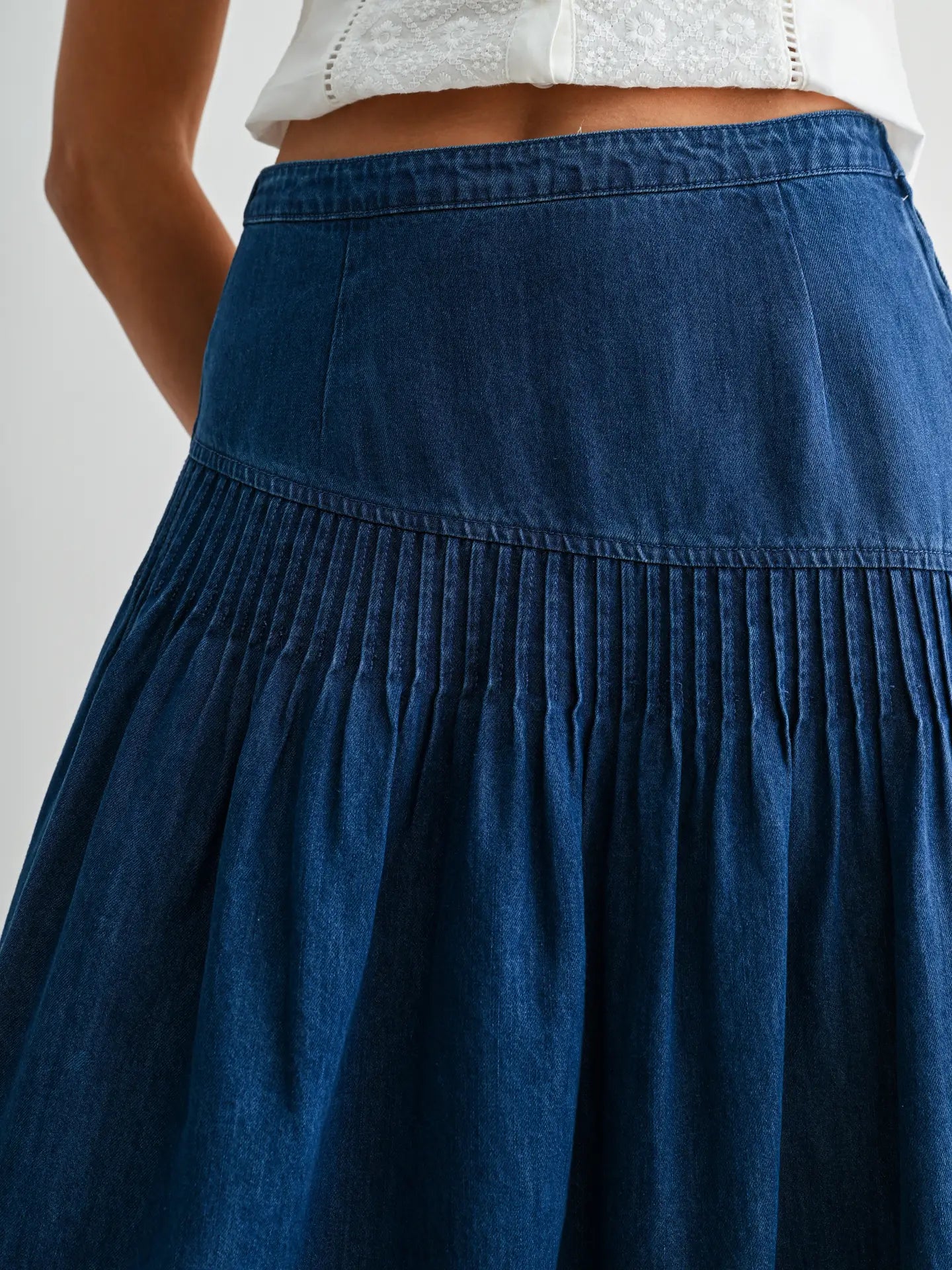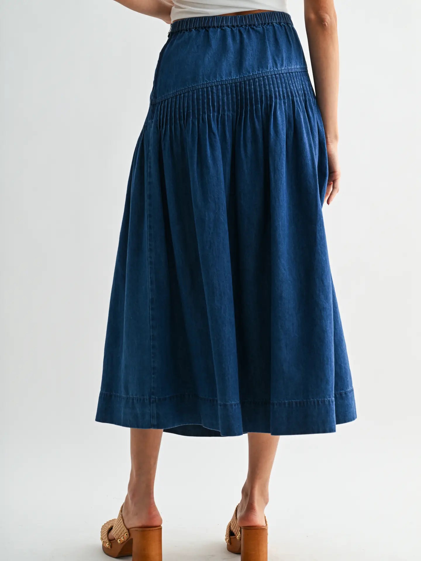 Elevate your everyday rotation with the Highlander Denim Midi Skirt—a wardrobe essential that doesn't take itself too seriously. This high-waisted beauty features a generous waistband and a gathered, slightly flared cut that moves with you, whether you're running errands or grabbing coffee with friends. The timeless blue wash pairs effortlessly with everything from graphic tees to cozy sweaters, making it the kind of piece you'll reach for again and again. Comfortable, versatile, and undeniably chic.