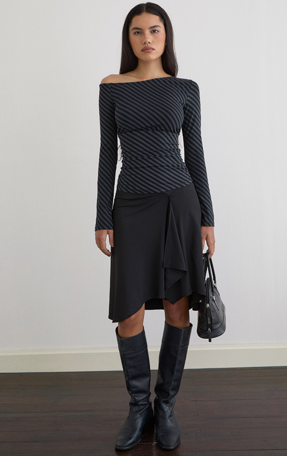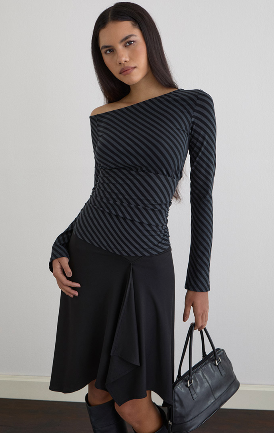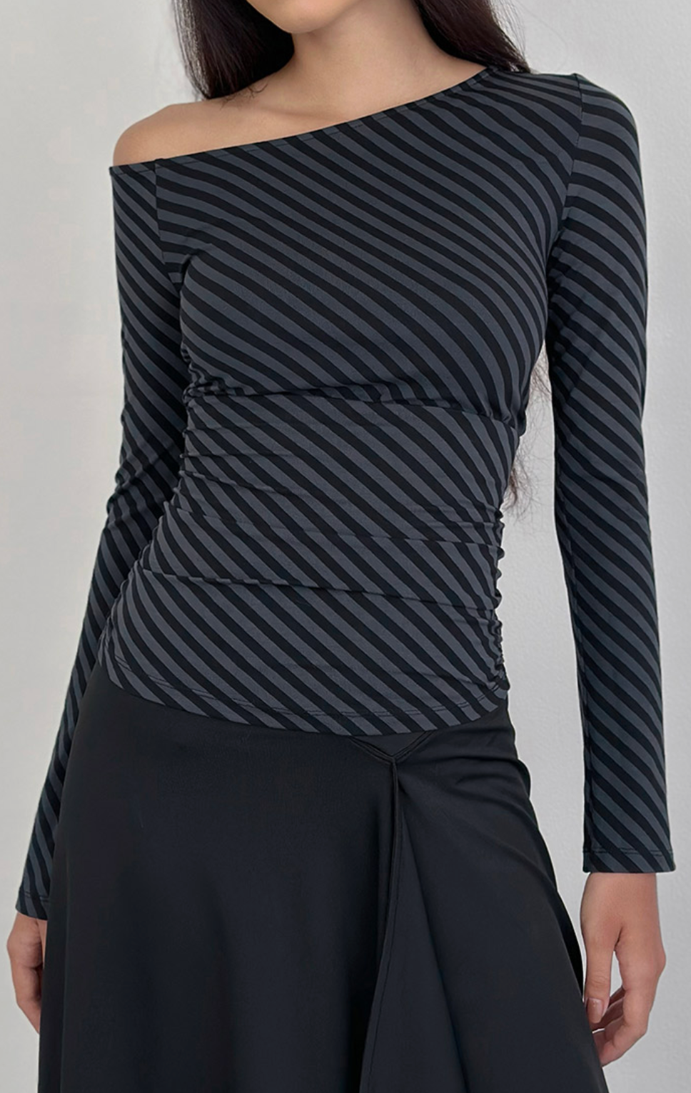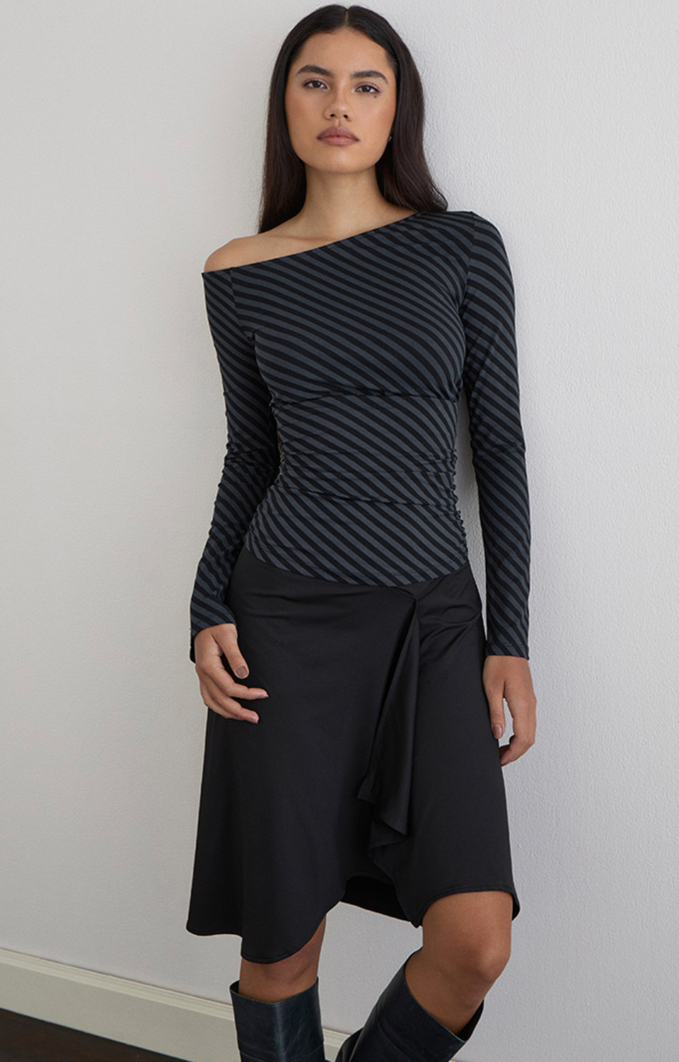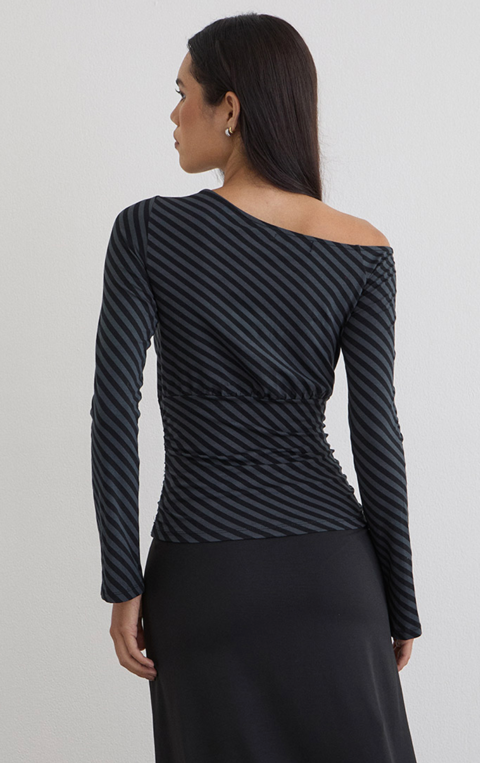 The Hoang Top brings effortless elegance with its ocean storm oblique stripe print on silky rayon jersey. This playful piece features a chic off-the-shoulder neckline, long fluted sleeves that add movement, and strategic under-bust ruching that flatters your silhouette. The deep waist panel creates beautiful dimension and visual interest. Perfect for dressing up casual moments or adding a touch of coastal-inspired style to your everyday rotation.