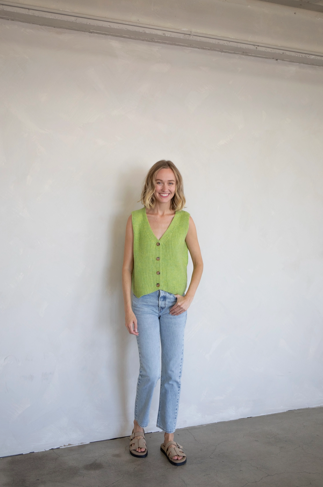 The Lani Vest is your new go-to for cozy, playful style. Featuring a relaxed fit with a flattering V neckline, this ribbed tri-blend vest comes in a charming green shade that’s full of personality. Tortoise shell buttons add a fun, vintage touch, while the soft fabric keeps you comfy all day long. Perfect for layering or wearing on its own, the Lani Vest brings a splash of color and comfort to any outfit.