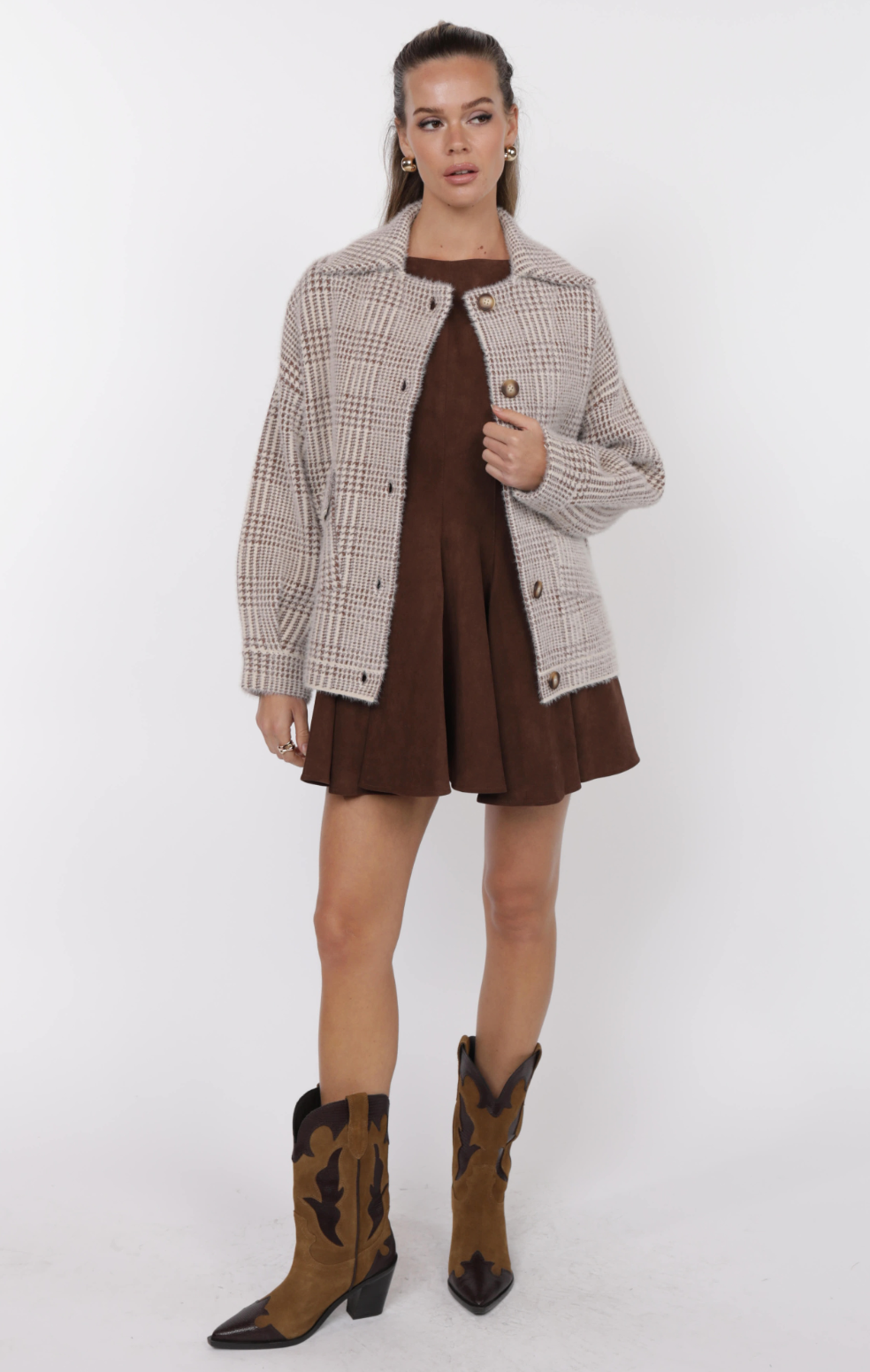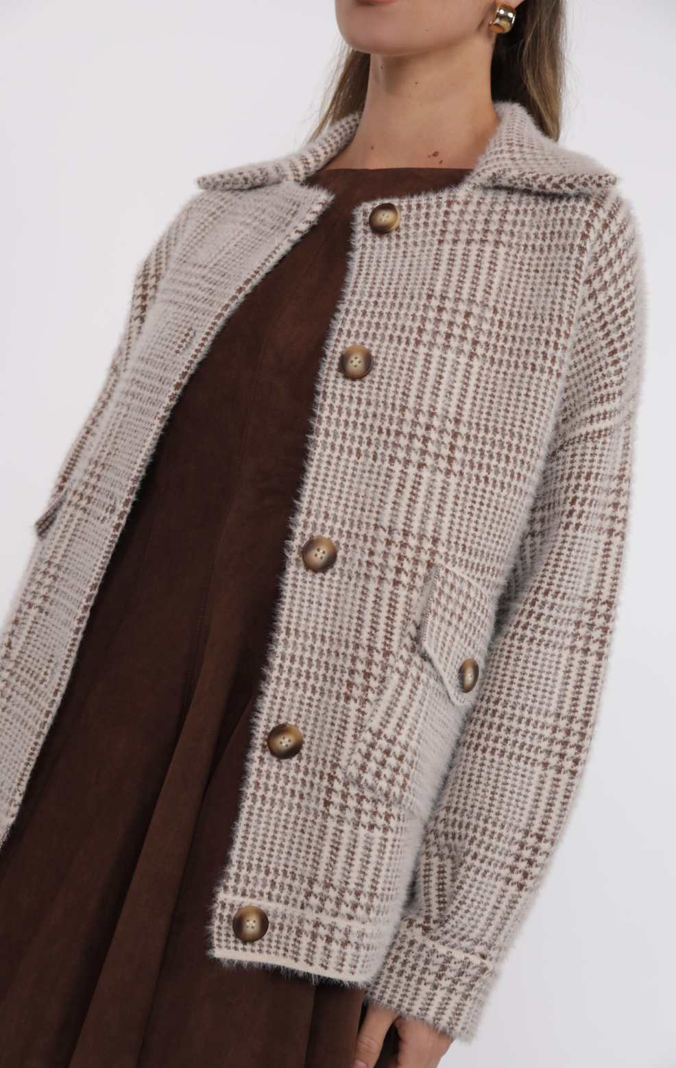 Wrap yourself in cozy charm with the Lola Plaid Sweater Jacket in a warm ivory brown colorway. This super soft plaid jacket features a classic collar, button front, and handy front pockets—ideal for stashing your essentials. With its perfect length and playful vibe, it’s your go-to for crisp fall days and game day excitement. A darling must-have that brings both comfort and style wherever you roam!