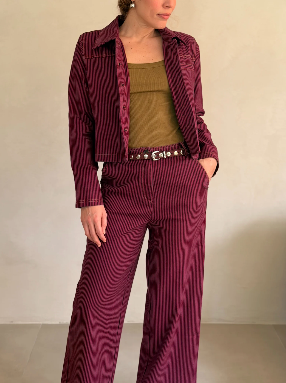 Embrace playful style with the Nigelle Pants in an adorable purple hue. Crafted from exclusive FRNCH fabric, these striped pants stretch comfortably across the waist and hips for all-day wear. Designed to fit true to size, they feature handy front and back pockets, belt loops, and a button-and-zipper closure. Perfect for adding a fun pop of color to any outfit while keeping comfort on point.
