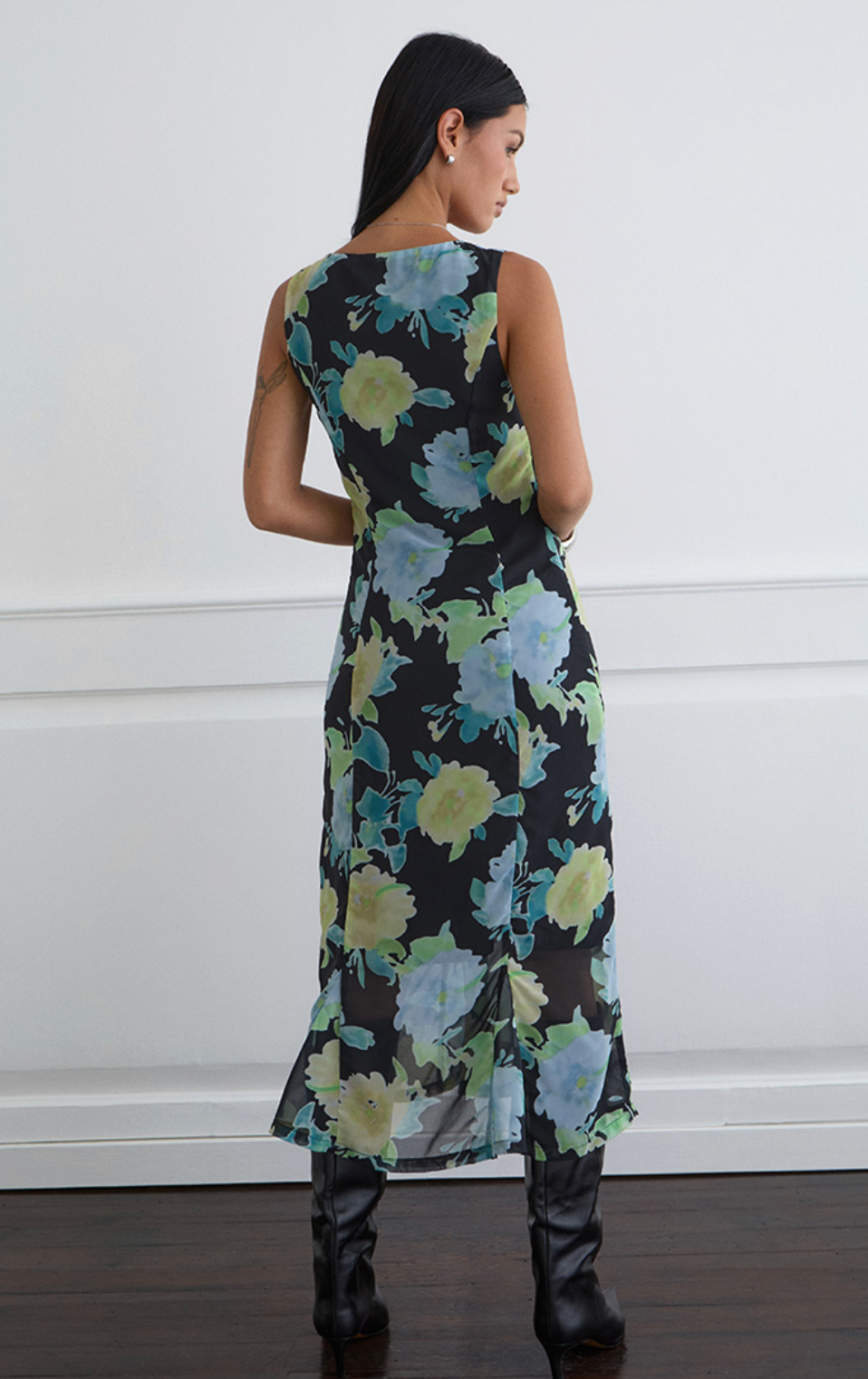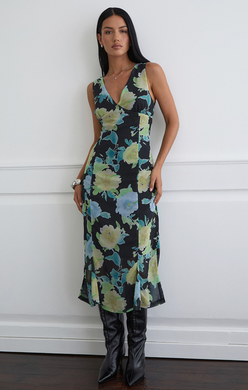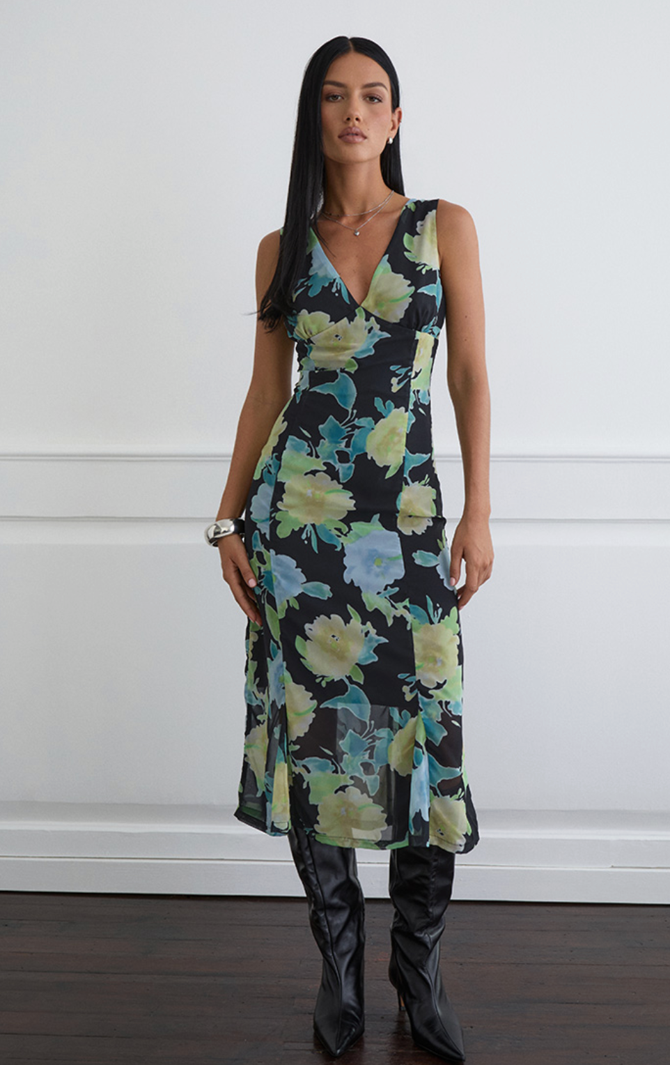 The Olydia Dress is your go-to piece for effortless elegance. Flowing in delicate crystal flower printed chiffon, this midi beauty features a flattering deep V-neckline and fitted waist that'll have you feeling fabulous. The soft fluted hem adds a playful twirl to every step. Perfect for brunches, garden parties, or whenever you want to look polished without trying too hard.