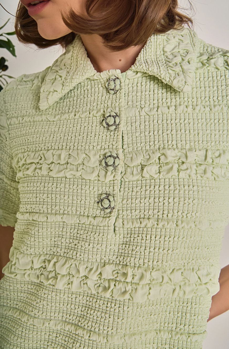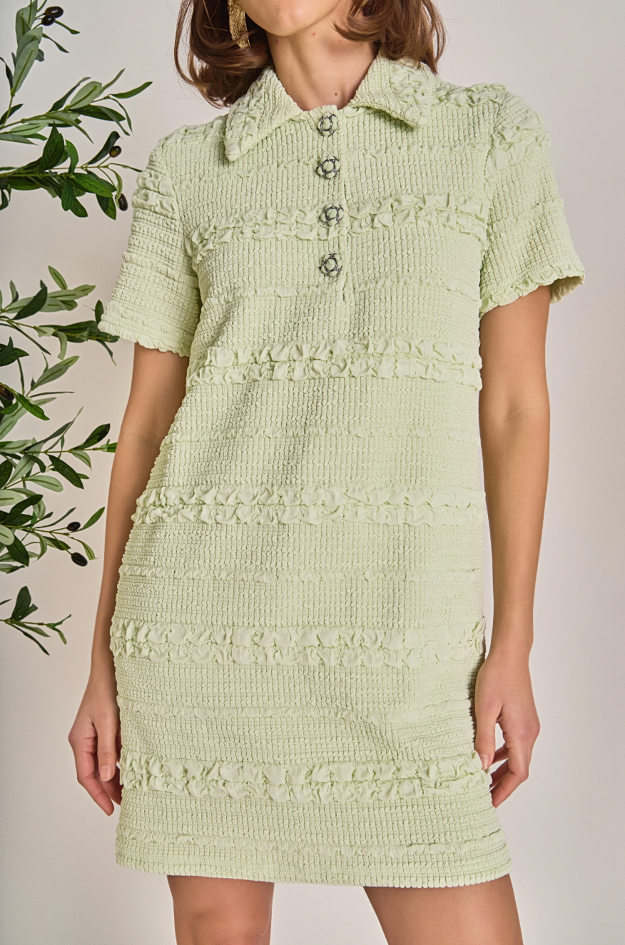 Slip into effortless elegance with the Palma Textured Mini Dress in pistachio green. This charming piece features a crisp collared neckline, statement buttons down the front placket, and gorgeous smocked detailing with horizontal ruffles that add serious personality. Short sleeves and a mini silhouette keep things breezy and fun, while the soft lining ensures all-day comfort. Whether you're heading to brunch or a sunset soirée, this versatile darling transitions beautifully from day to night with playful sophistication.