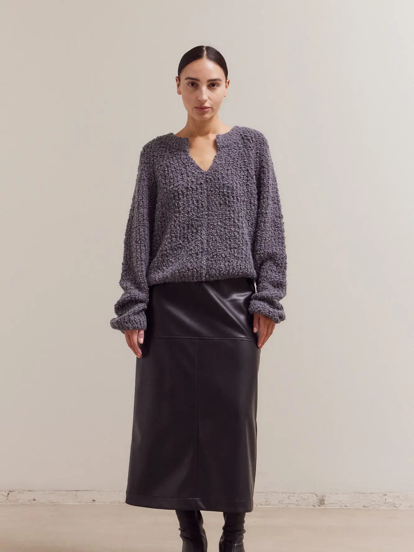 Wrap yourself in cozy charm with this Plush V Sweater. Its super plush, fuzzy texture in charcoal grey makes it the perfect winter companion. The opened v-neck adds a playful touch, while the soft fabric keeps you warm and comfy all season long. Get ready to snuggle up in style!