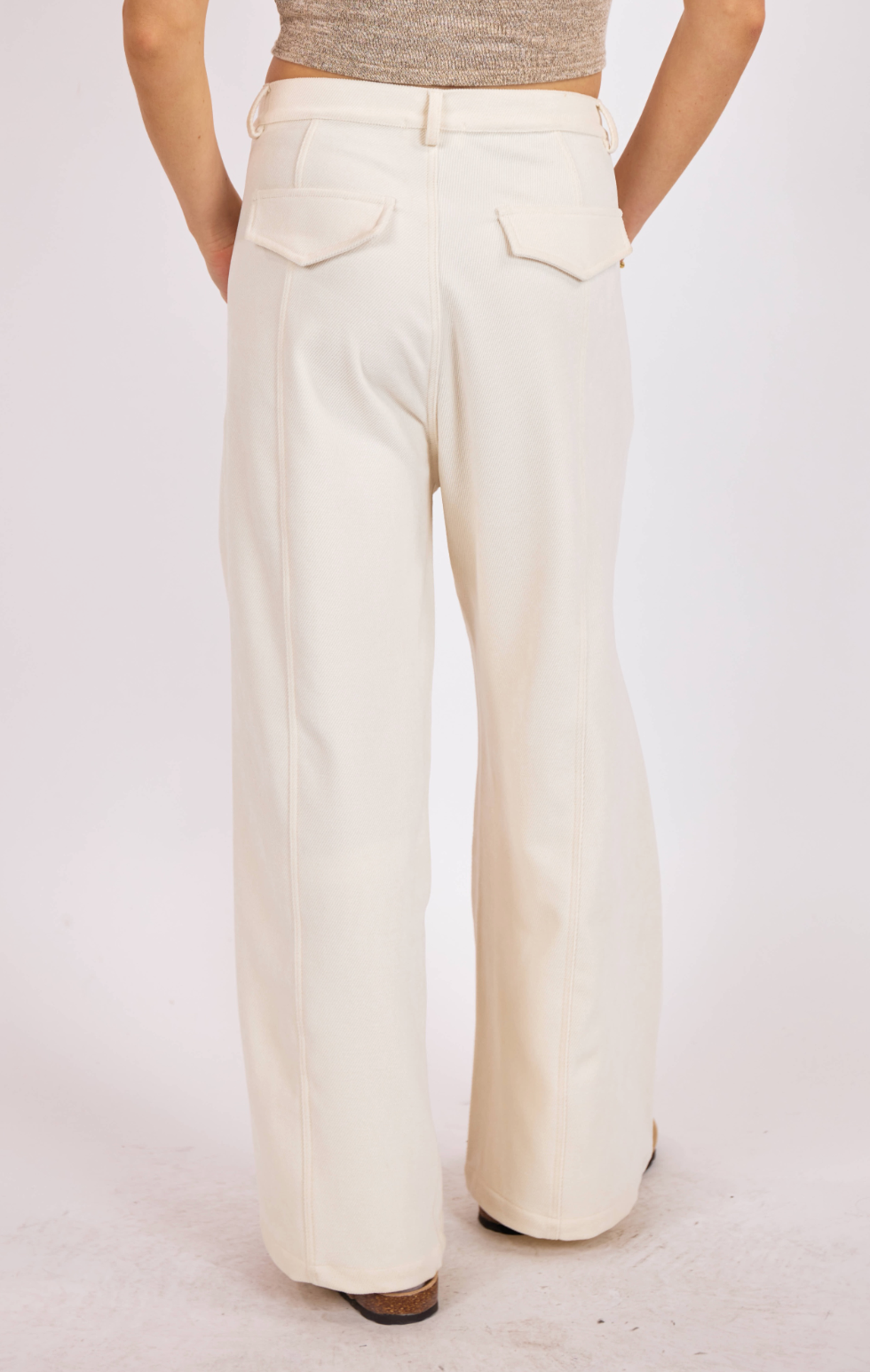 Introducing the Royal Pant—your new everyday essential that proves comfort and style aren't mutually exclusive. Crafted in lightweight cream cord fabric, these wide-leg beauties feature a flattering silhouette with darling seams and faux back pockets for that polished trouser vibe. The button-zip closure and subtle stretch fabric move with you, delivering supreme comfort whether you're running errands or heading out for the day. Effortlessly chic, endlessly wearable.