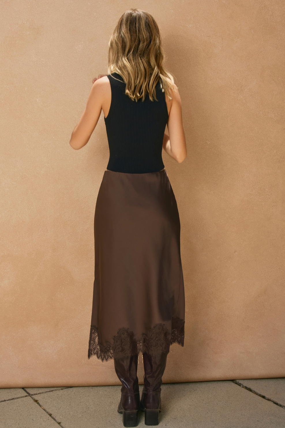Slip into effortless elegance with this satin midi skirt in rich dark chocolate. The pull-on elastic waistband means zero fuss—just step in and go. An A-line silhouette flatters every frame, while delicate lace trim at the hem adds a touch of romance. A practical side slit keeps things comfortable, and the lined interior ensures you're covered. Perfect for dressing up or down, this skirt is your new go-to piece for looking polished without the effort.