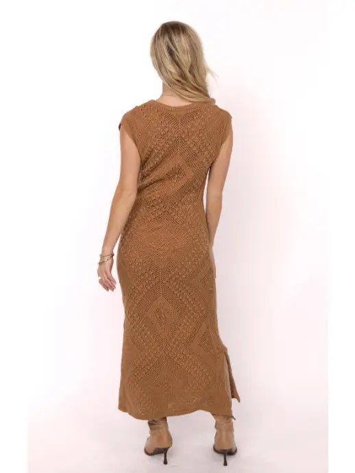 Cozy meets chic in this brown knit dress featuring a darling intricate pattern that turns heads wherever you go. Its long, lined fit offers comfort and warmth without sacrificing style. Perfectly versatile, it’s your go-to for casual days or classy nights out—dress it up or down and embrace effortless elegance with a playful twist.